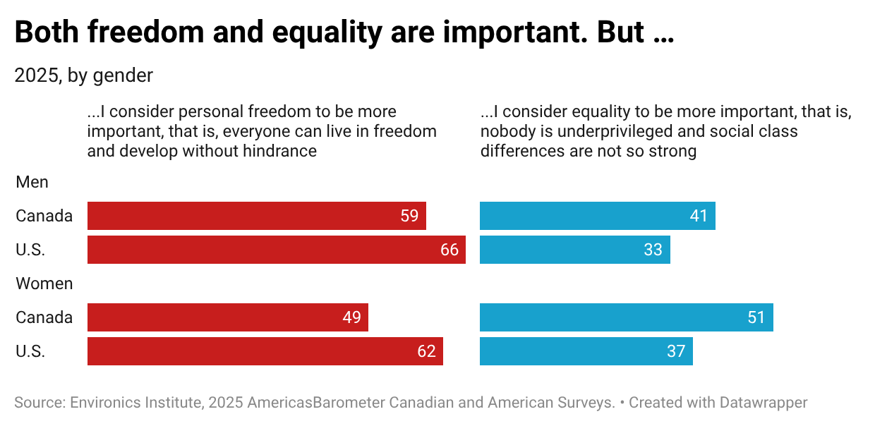 There are a few other interesting wrinkles. The gender gap in the U.S. is a bit smaller (4 points, compared to 10 points in Canada, among those who consider freedom more important). In both Canada and the U.S., a majority of men consider freedom more important. But, while a majority of women in the U.S. also hold this view, this is not the case for women in Canada, who are evenly divided between the two values (jump back to Part Two in this series to see how this result is driven in particular by women in Quebec).